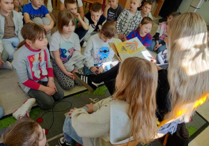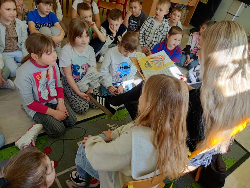 Było to spotkanie pełne uśmiechu, zaciekawienia i wspólnego przeżywania literackich przygód. Dzieci z zainteresowaniem słuchały historii, aktywnie reagowały i chętnie dzieliły się swoimi spostrzeżeniami.