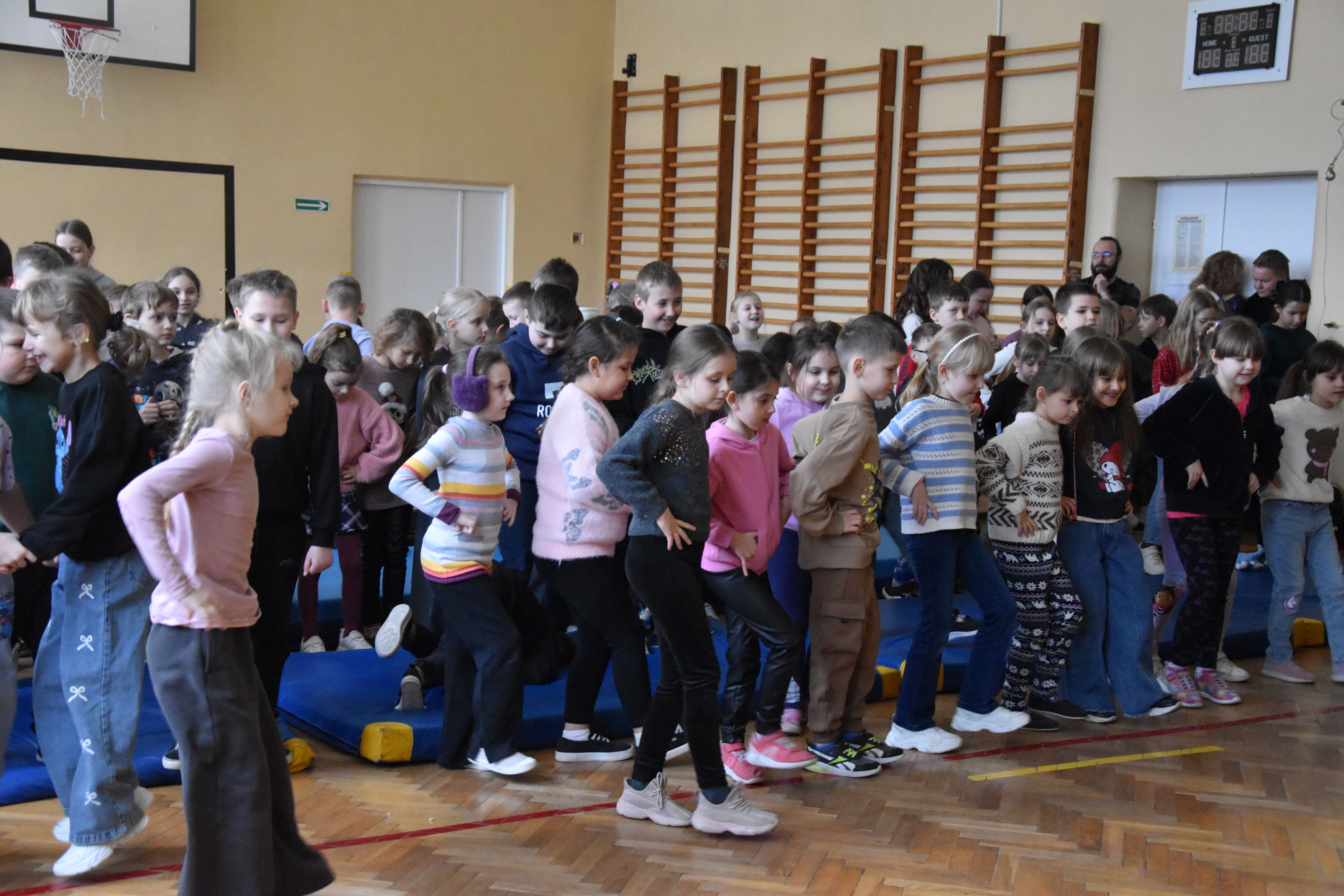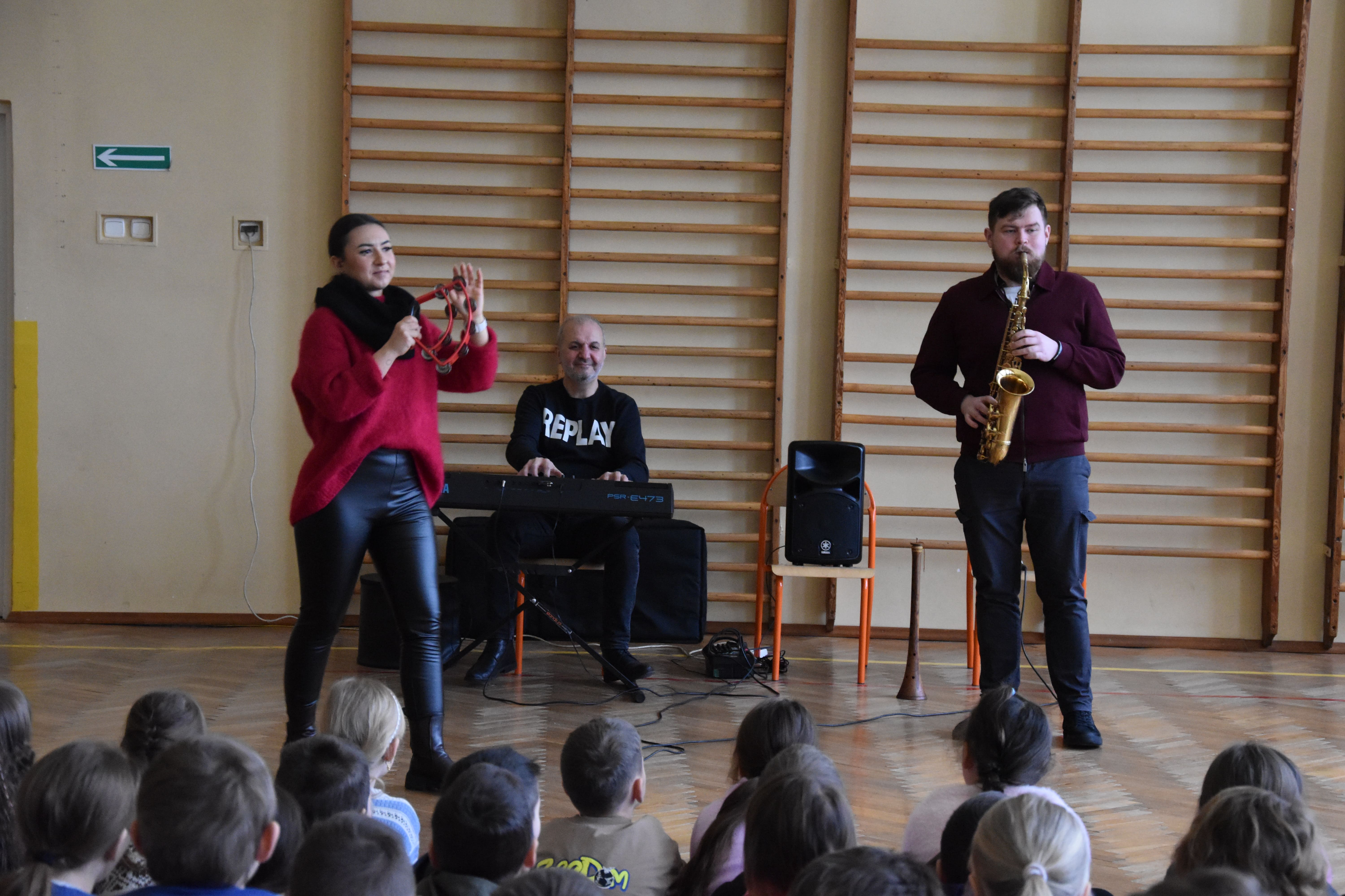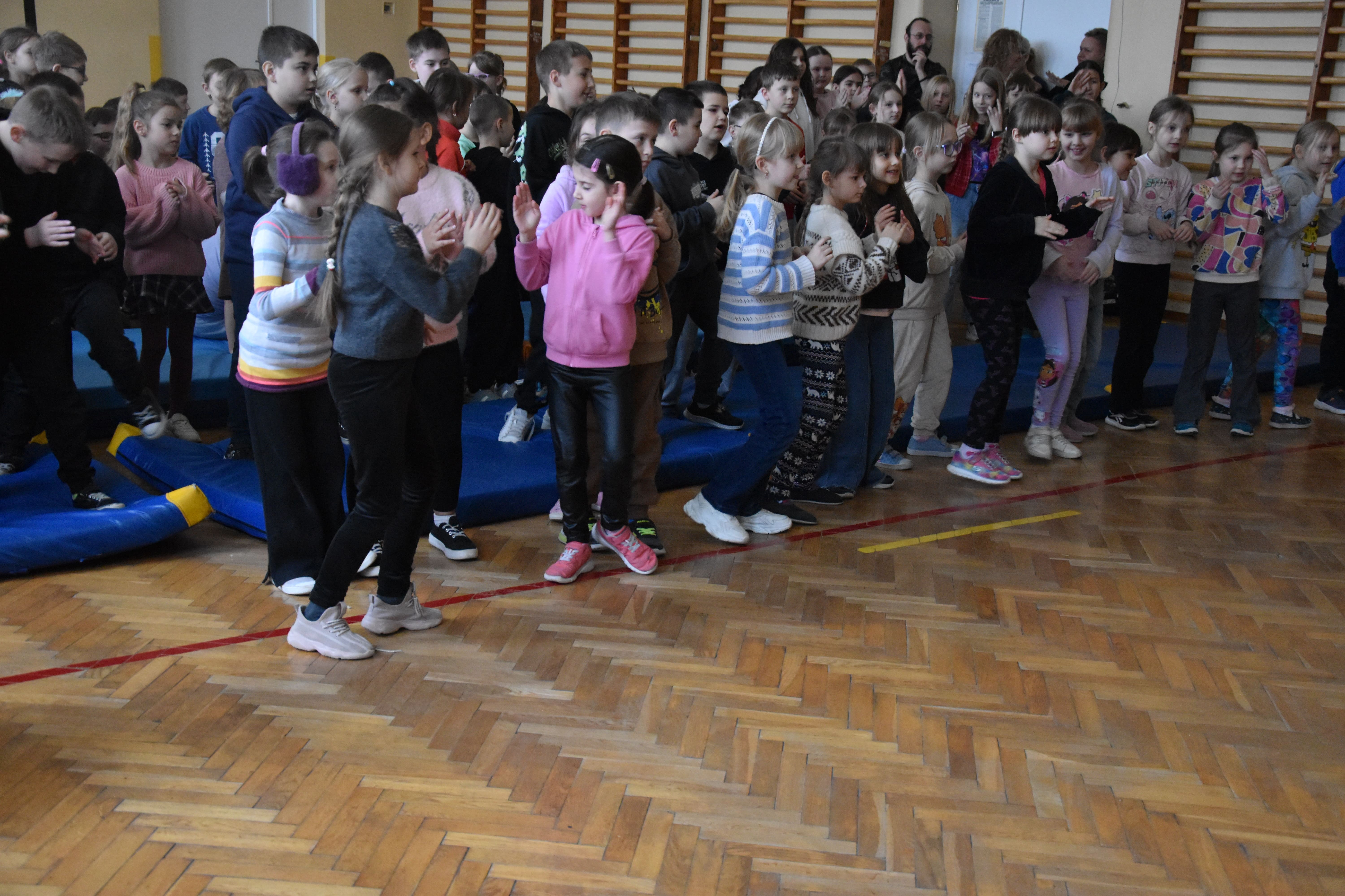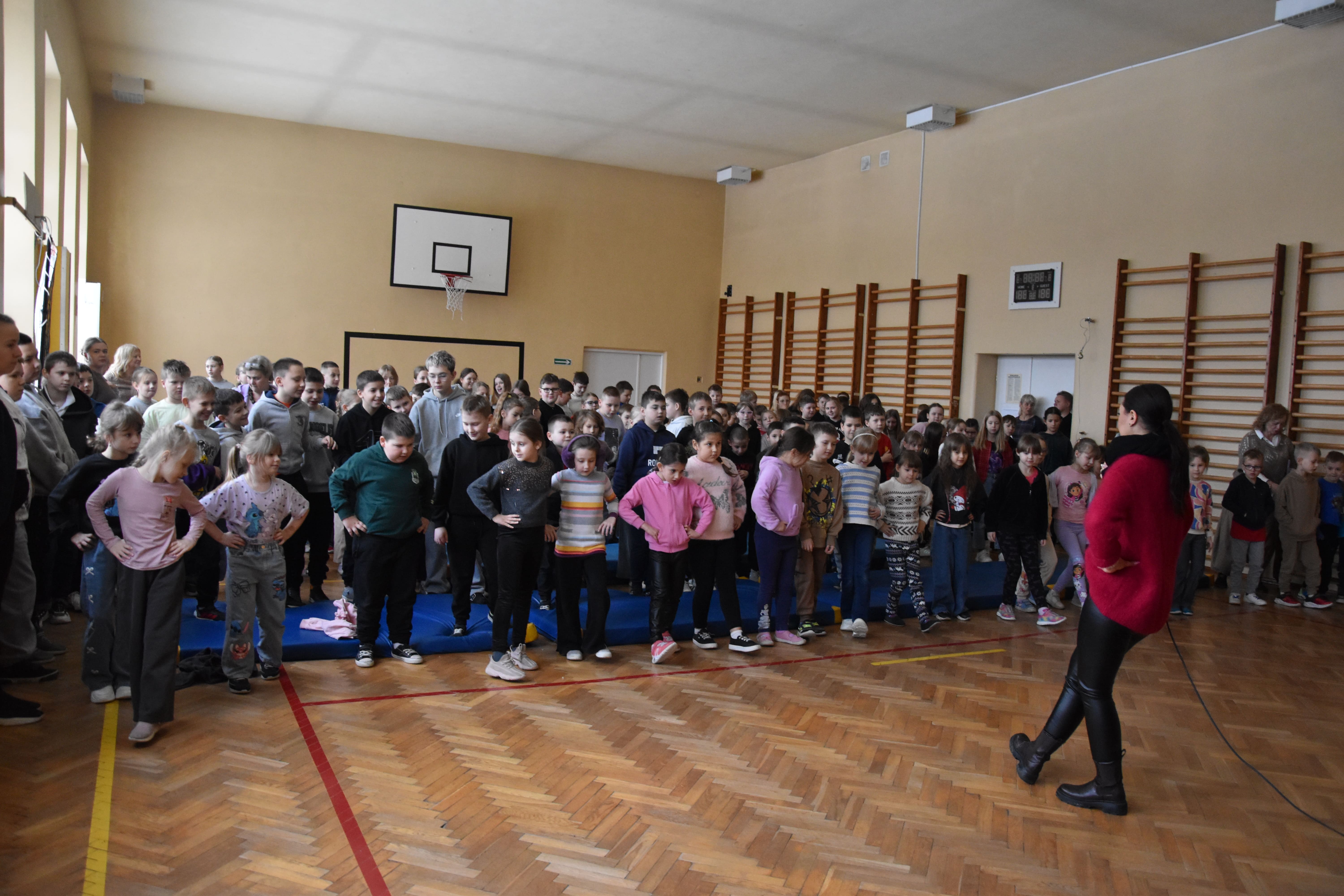 Koncert miał także część aktywną, uczniowie z dużym zaangażowaniem włączyli się we wspólną naukę układu tanecznego, którego elementy poznawali podczas występu. Radość, ruch i muzyka sprawiły, że wydarzenie na długo pozostanie w pamięci dzieci.
