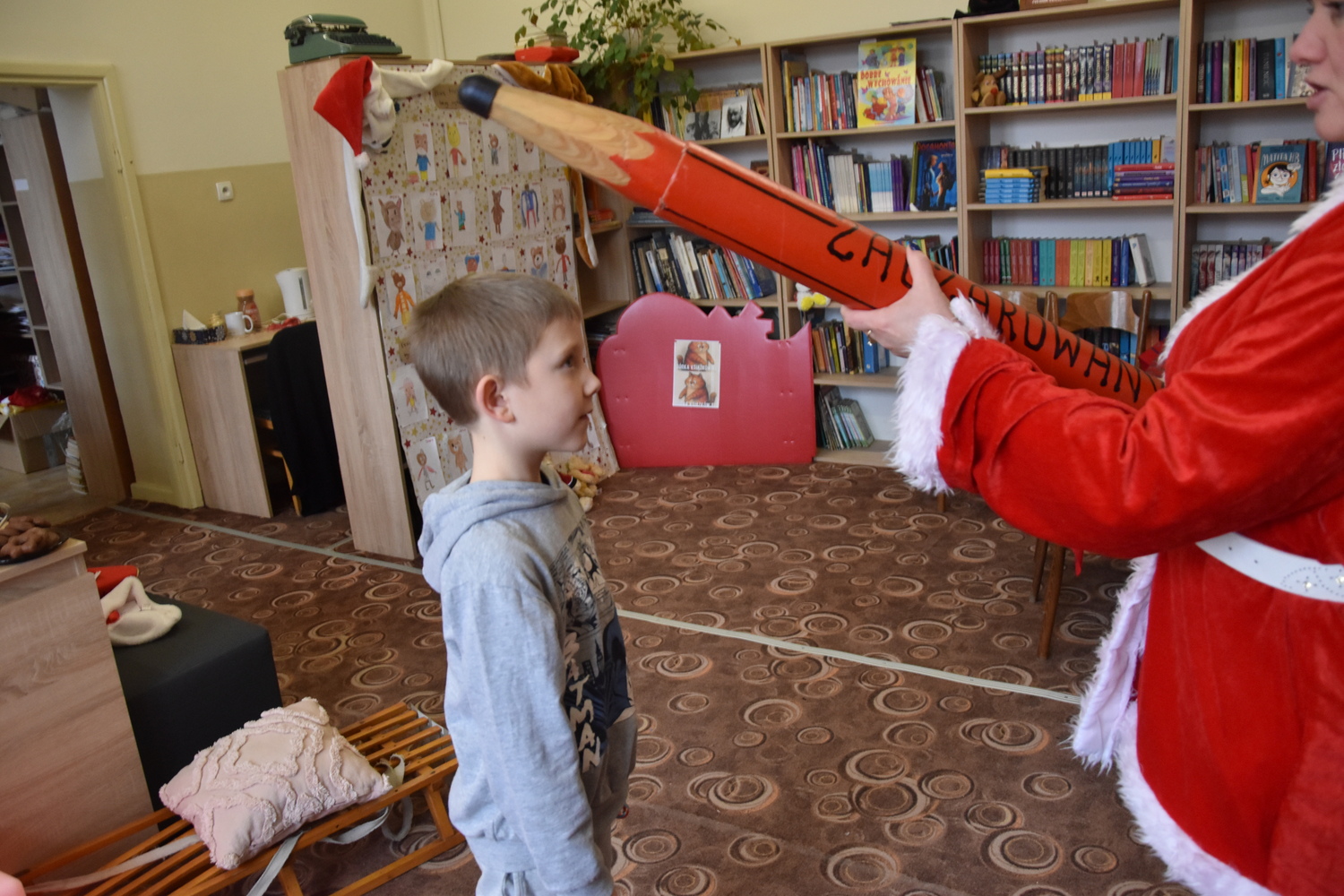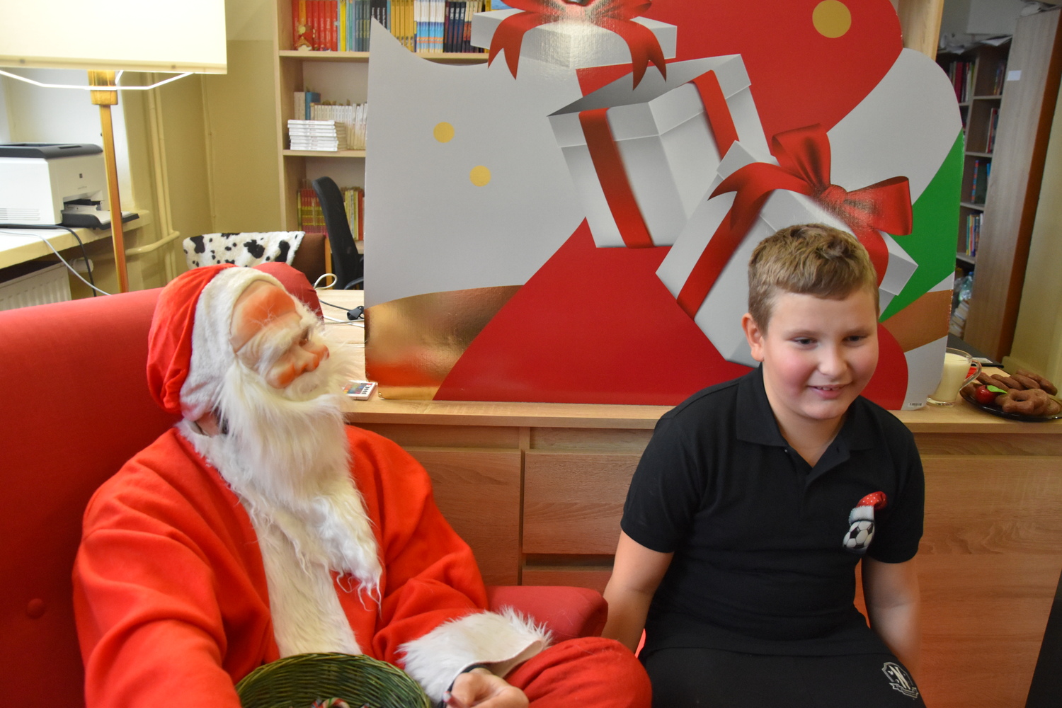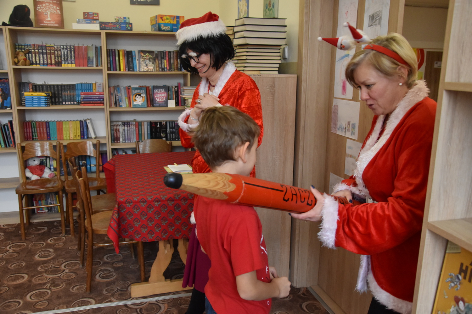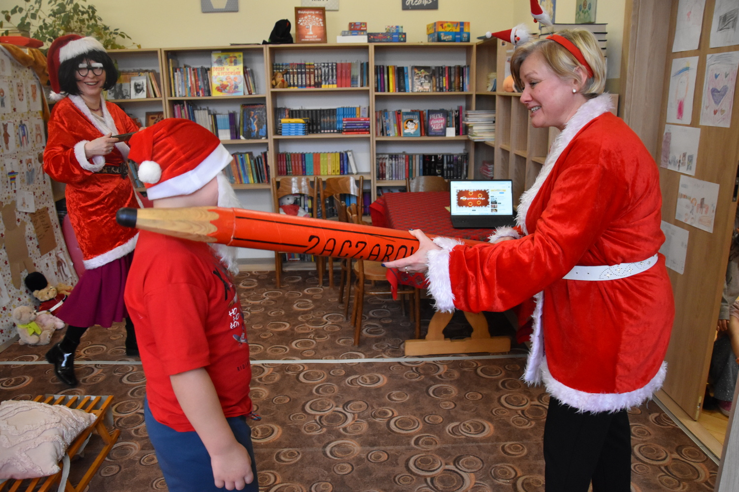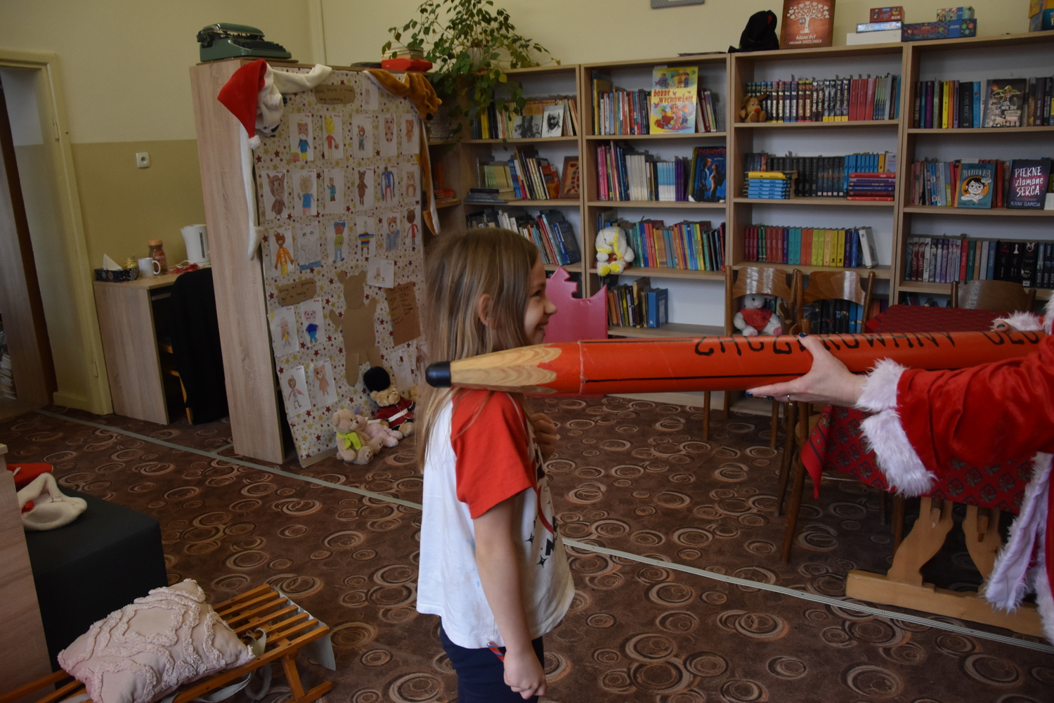 Podczas spotkania Mikołaj zwrócił się do dzieci z krótkim, wesołym pytaniem, sprawdzając ich gotowość do rozpoczęcia przygody z książką. Uczniowie poradzili sobie z nim doskonale, dzięki czemu każdy z nich mógł zostać uroczyście pasowany przez wyjątkową pomocnicę Mikołaja.