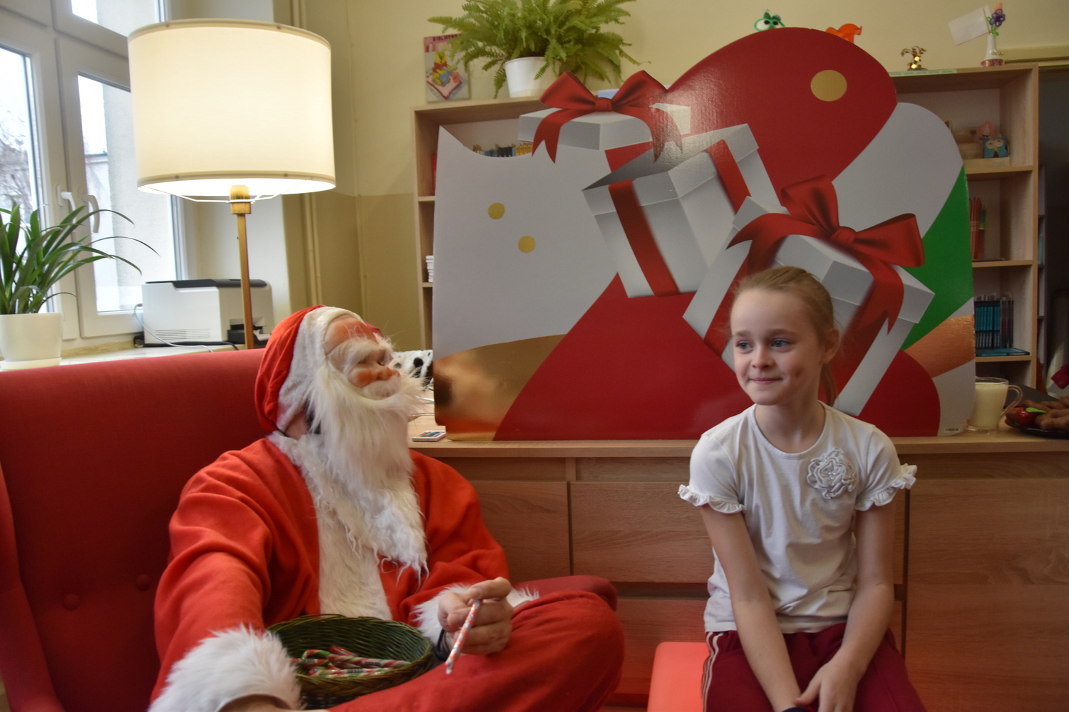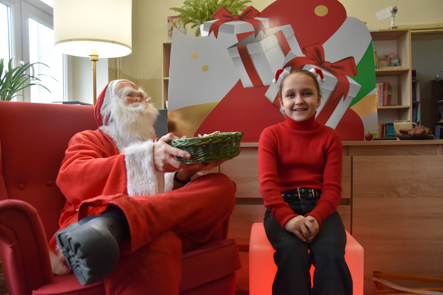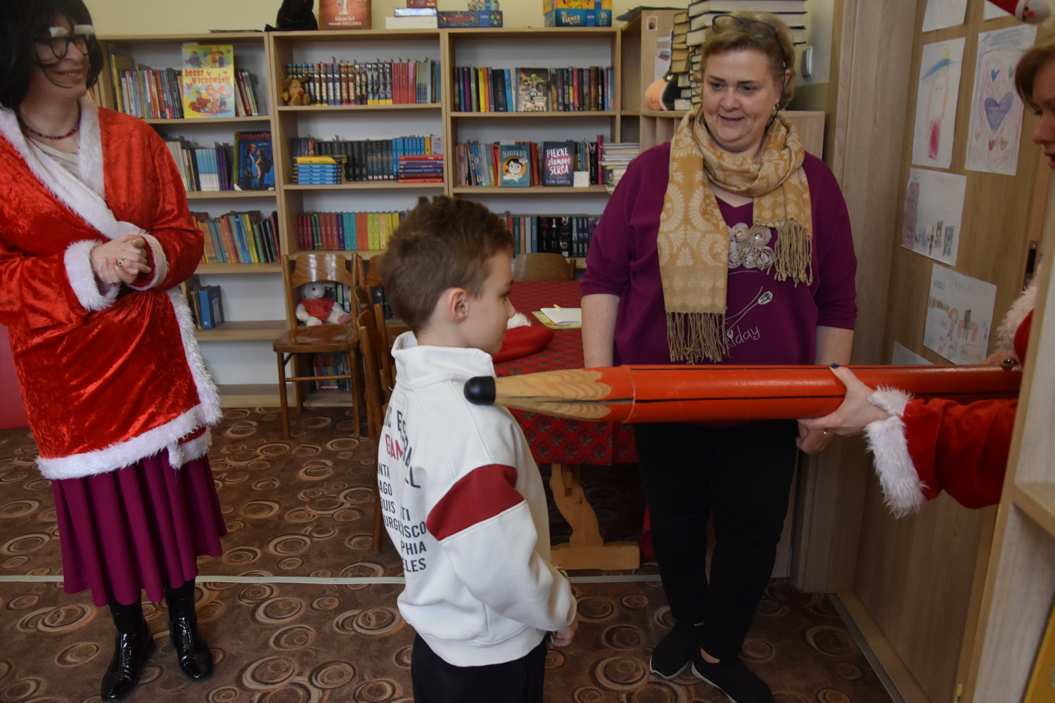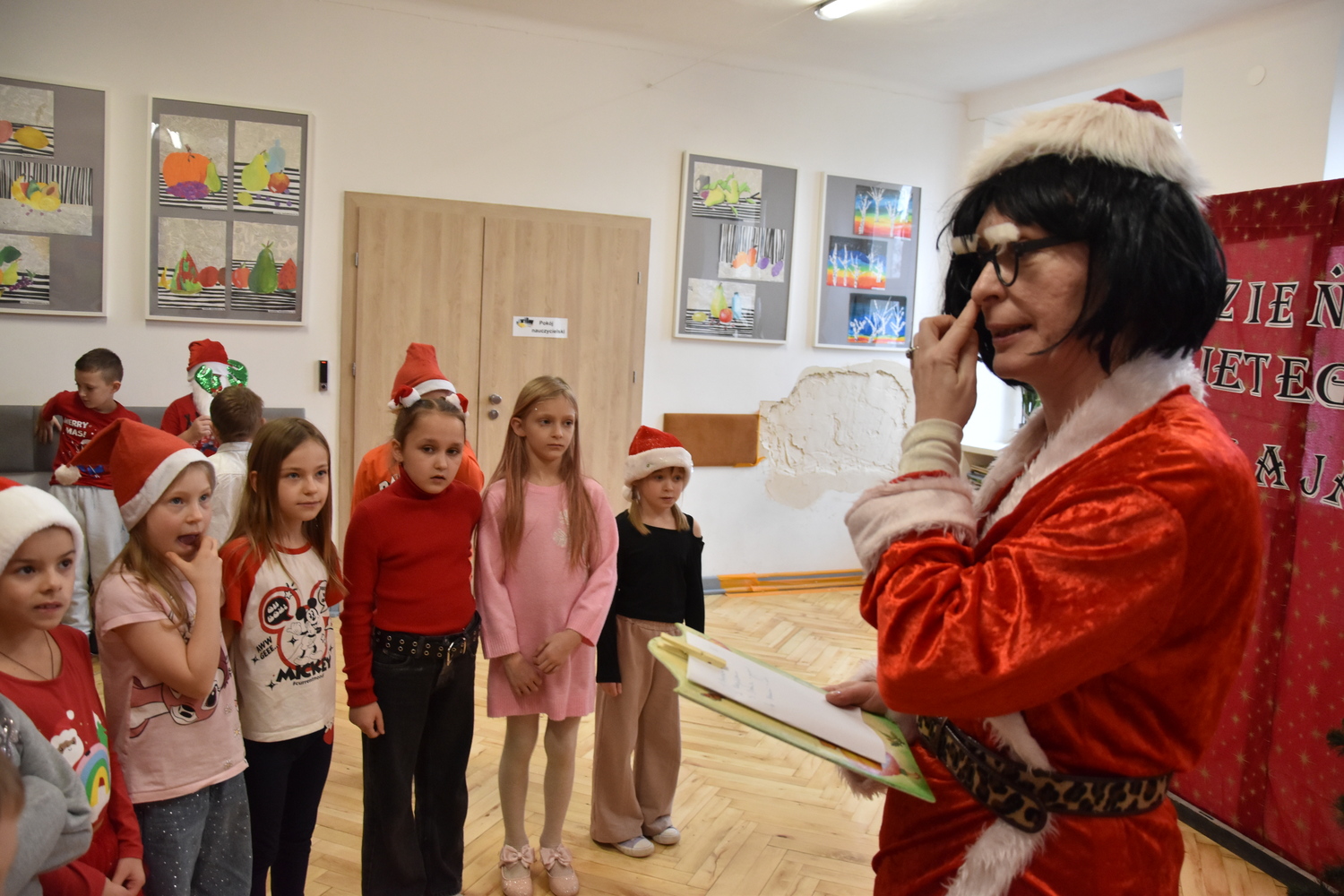 Podczas spotkania Mikołaj zwrócił się do dzieci z krótkim, wesołym pytaniem, sprawdzając ich gotowość do rozpoczęcia przygody z książką. Uczniowie poradzili sobie z nim doskonale, dzięki czemu każdy z nich mógł zostać uroczyście pasowany przez wyjątkową pomocnicę Mikołaja.
