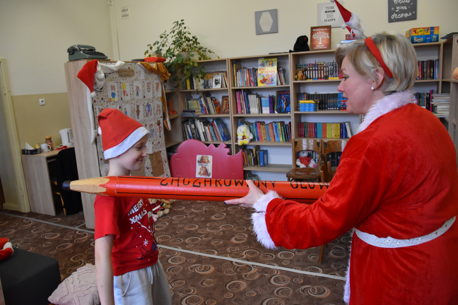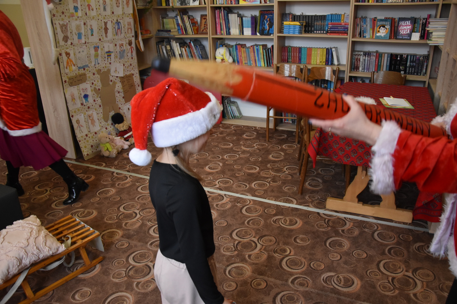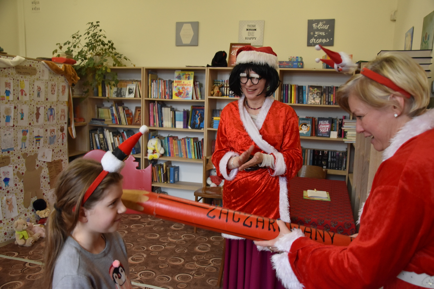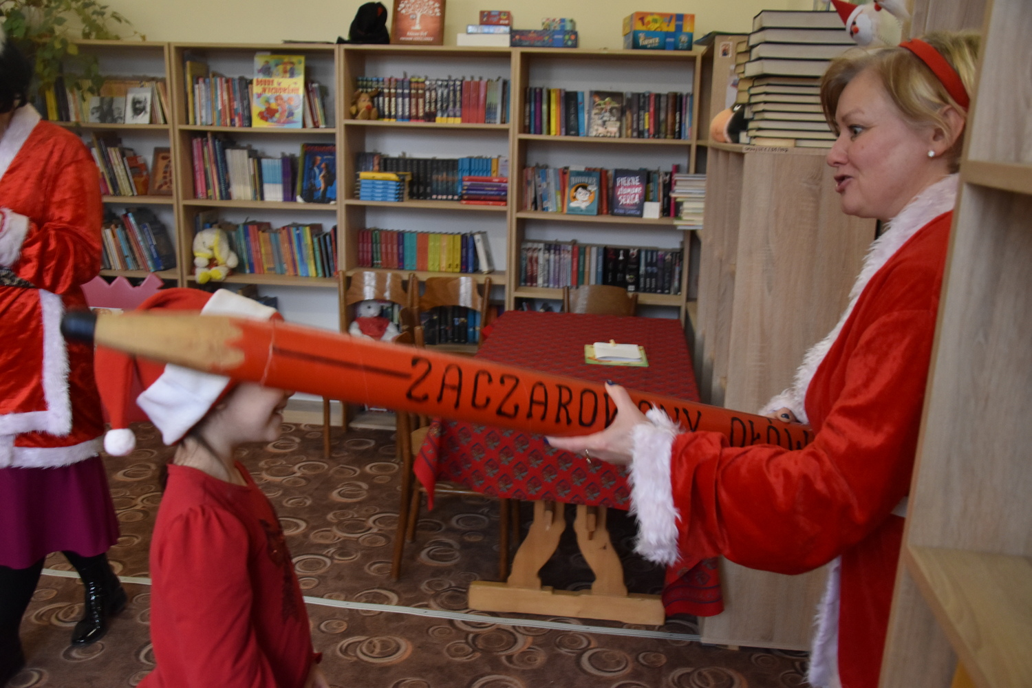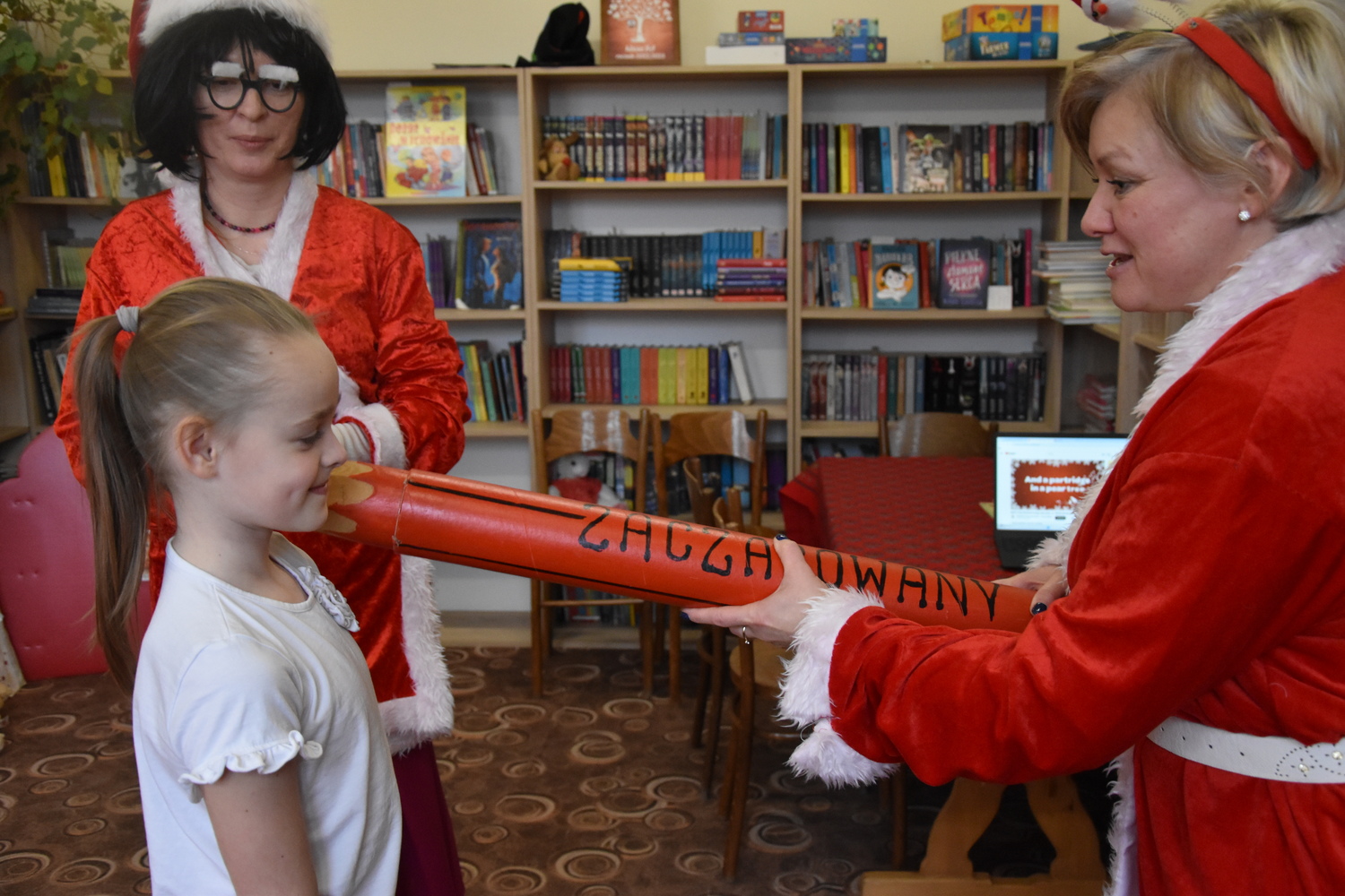 Podczas spotkania Mikołaj zwrócił się do dzieci z krótkim, wesołym pytaniem, sprawdzając ich gotowość do rozpoczęcia przygody z książką. Uczniowie poradzili sobie z nim doskonale, dzięki czemu każdy z nich mógł zostać uroczyście pasowany przez wyjątkową pomocnicę Mikołaja.