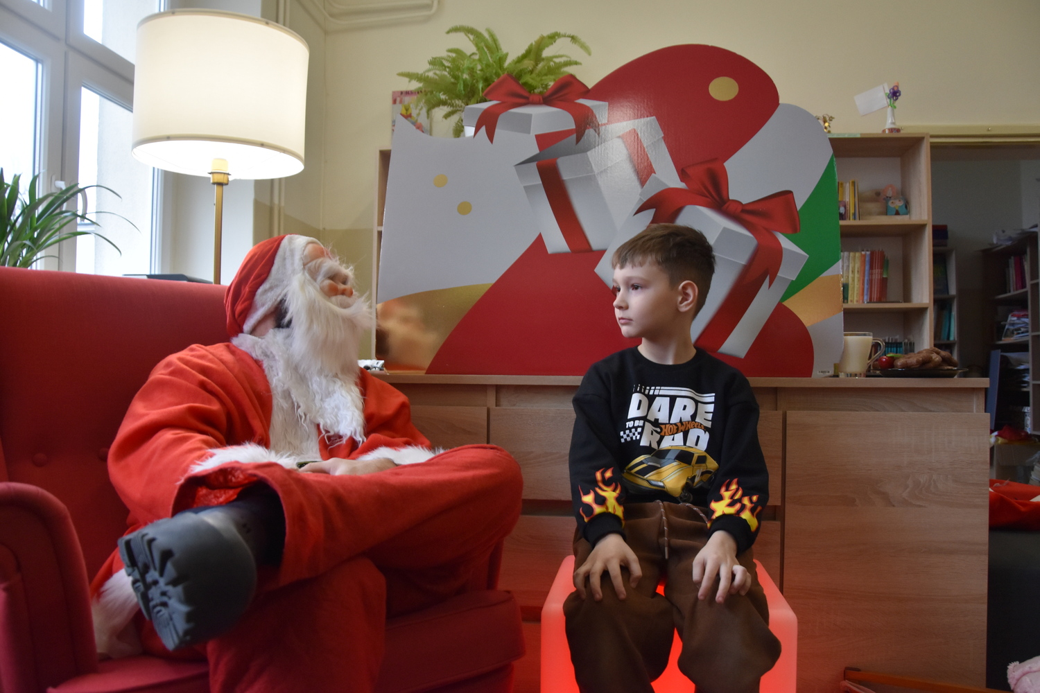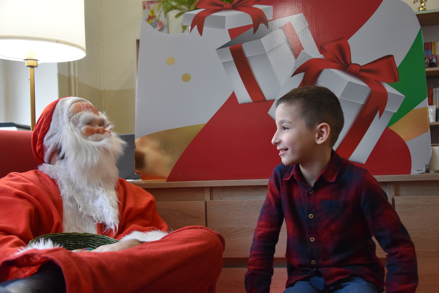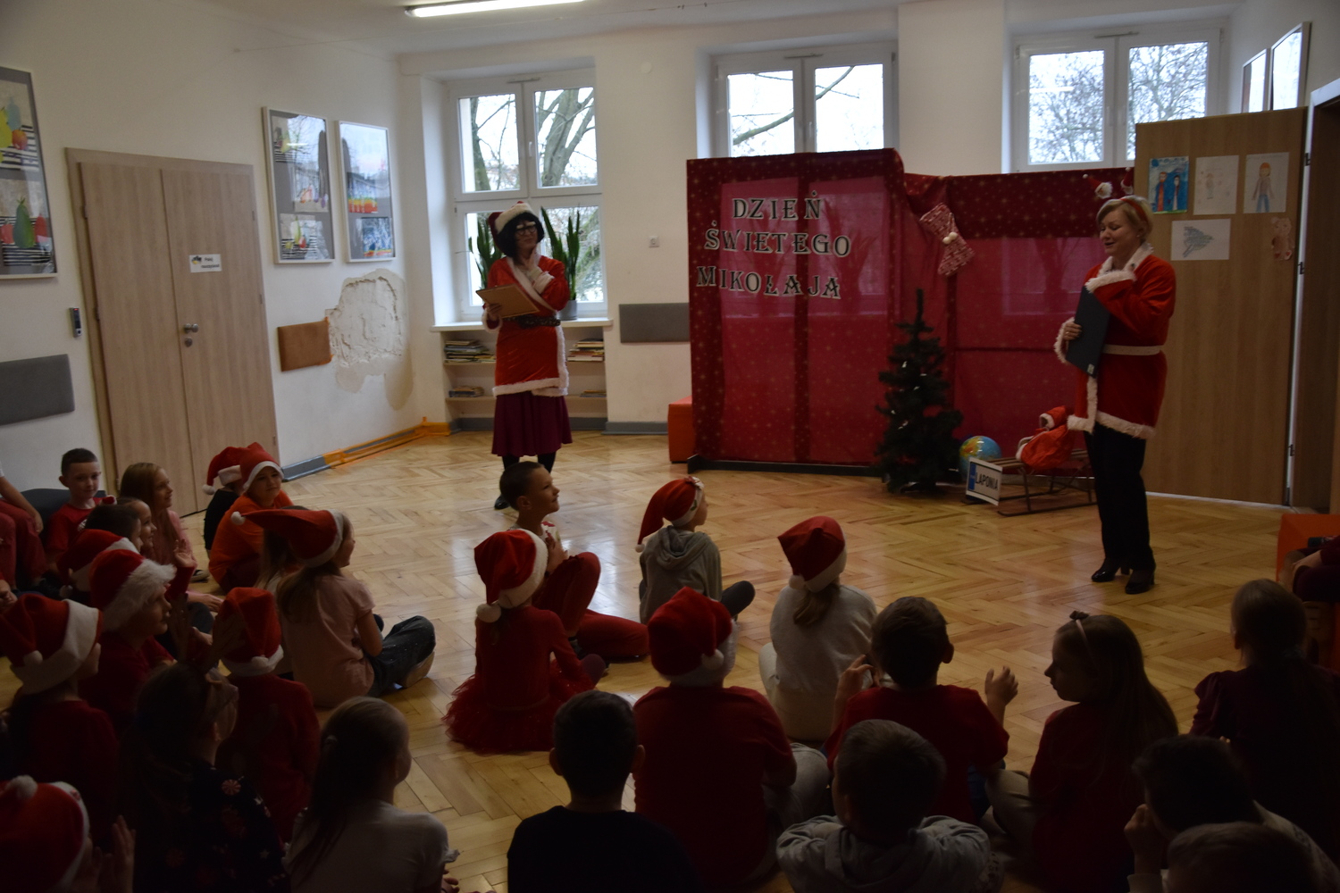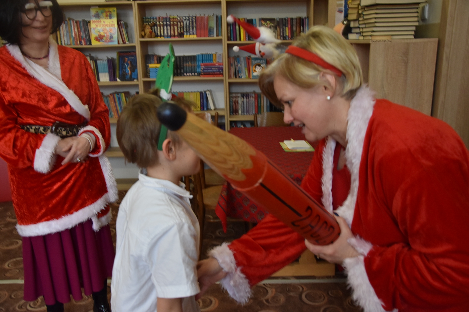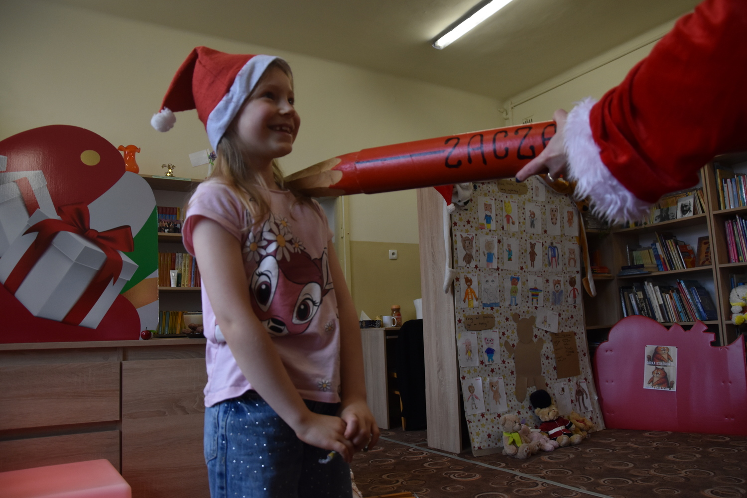 Podczas spotkania Mikołaj zwrócił się do dzieci z krótkim, wesołym pytaniem, sprawdzając ich gotowość do rozpoczęcia przygody z książką. Uczniowie poradzili sobie z nim doskonale, dzięki czemu każdy z nich mógł zostać uroczyście pasowany przez wyjątkową pomocnicę Mikołaja.