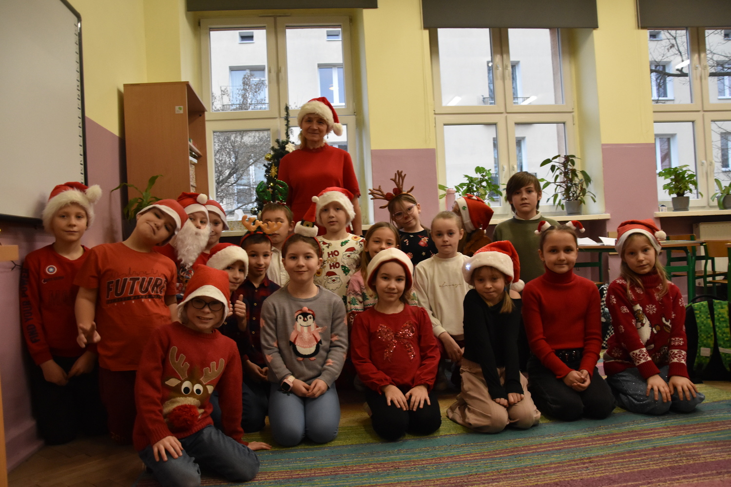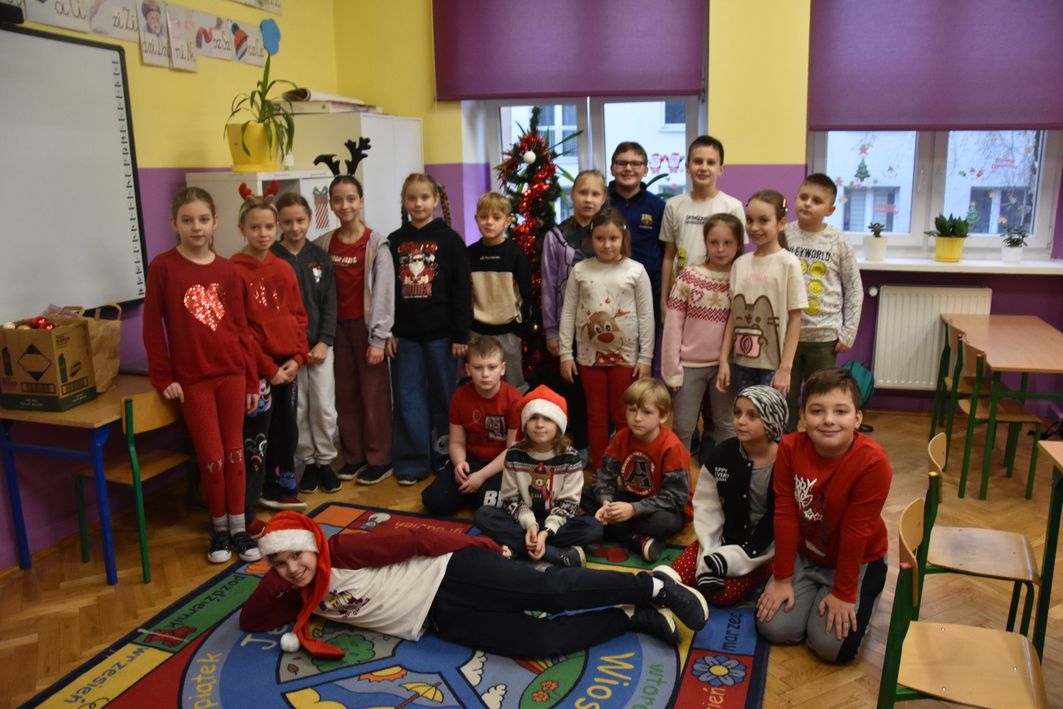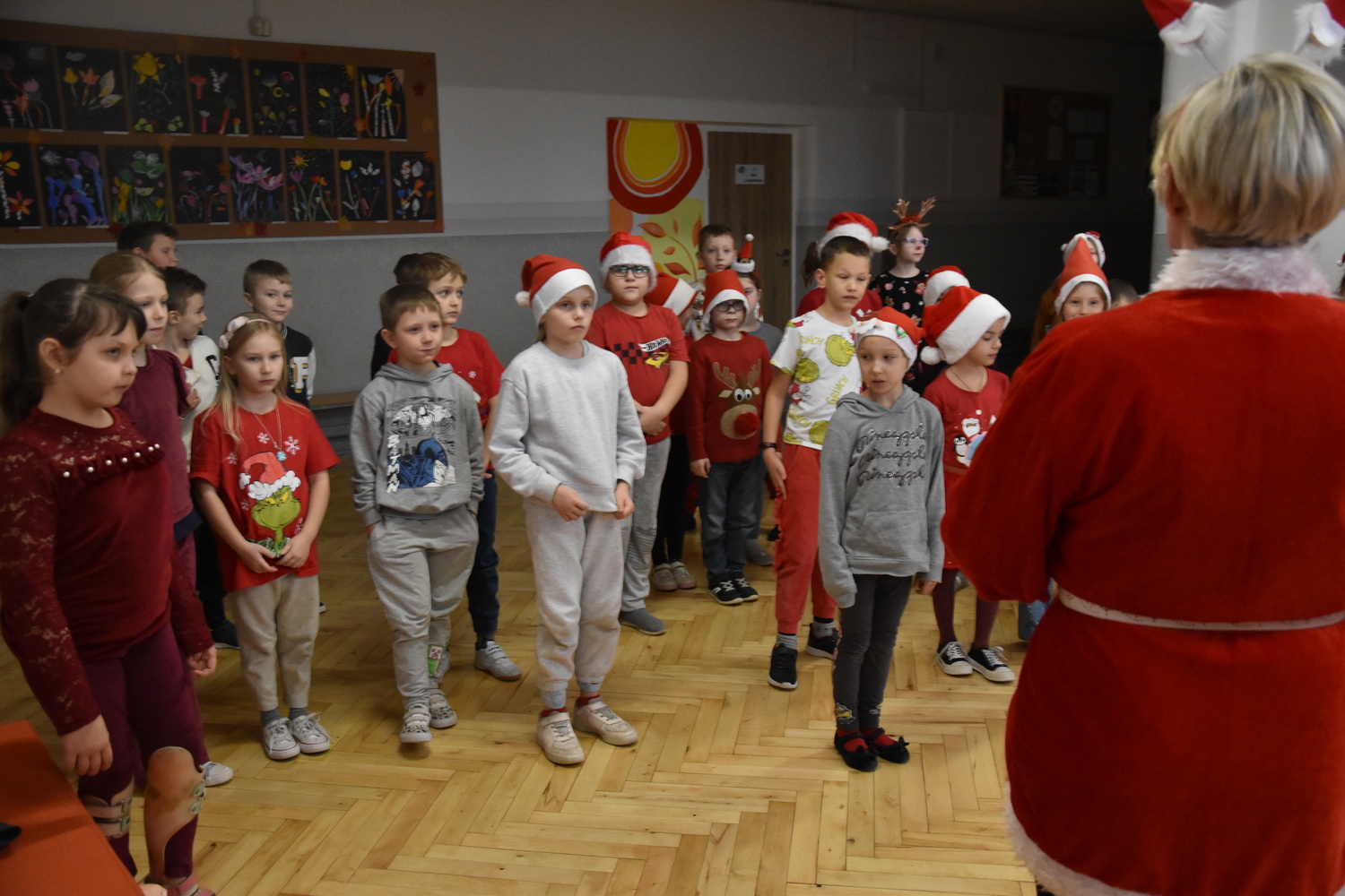 Na zakończenie Mikołaj obdarował wszystkich uczniów słodkimi upominkami, co wywołało wiele uśmiechów i dodatkowo podkreśliło świąteczny charakter spotkania.